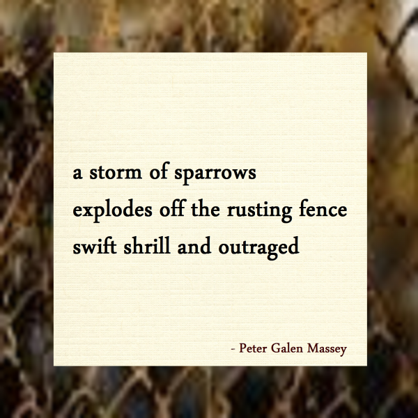 a storm of sparrows / explodes off the rusting fence / swift shrill and outraged