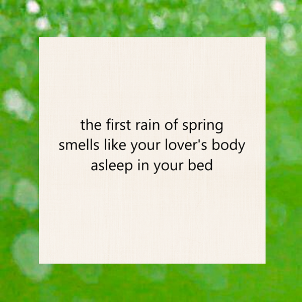the first rain of spring / smells like your lover’s body / asleep in your bed