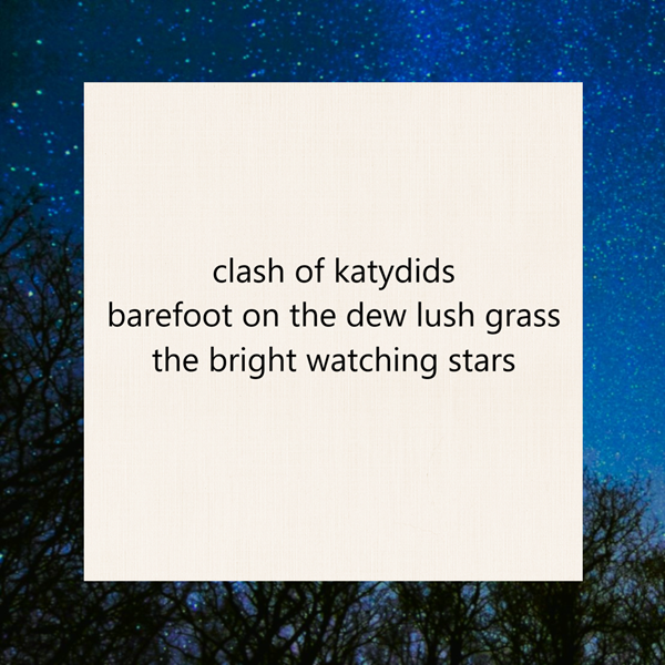 clash of katydids / barefoot on the dew lush grass / the bright watching stars