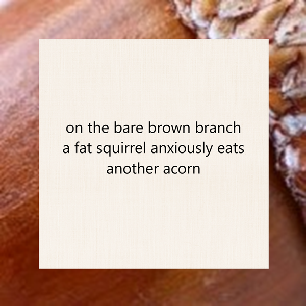 on the bare brown branch / a fat squirrel anxiously eats / another acorn