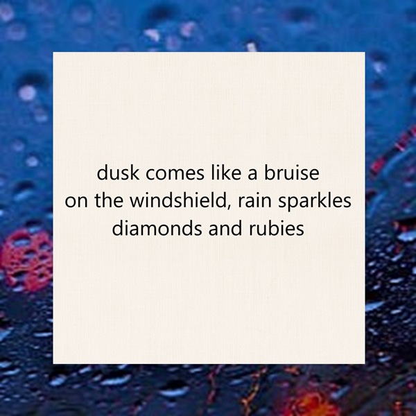 dusk comes like a bruise / on the windshield, rain sparkles / diamonds and rubies